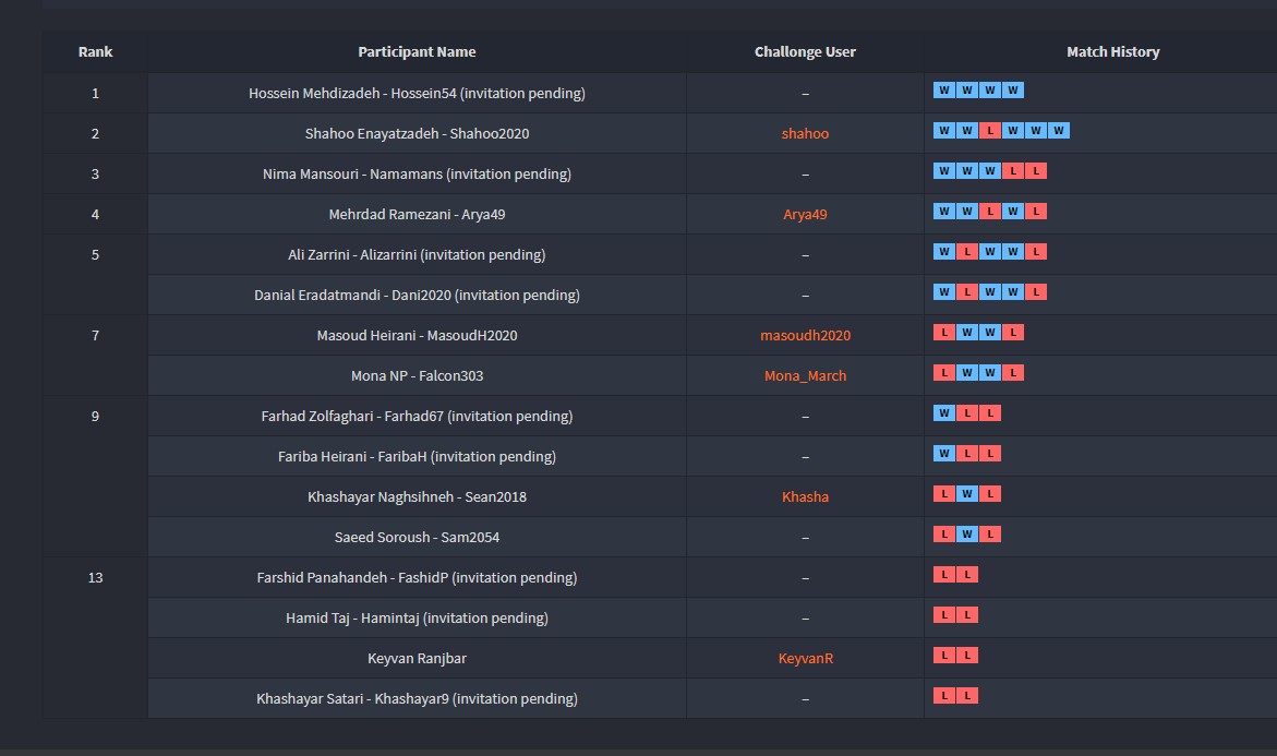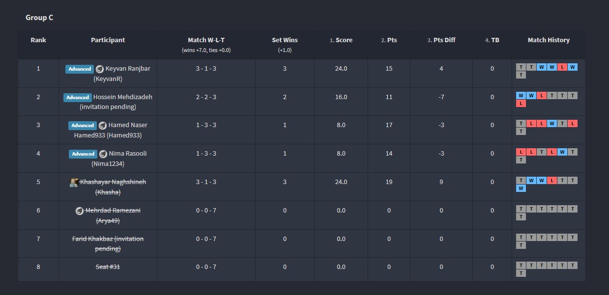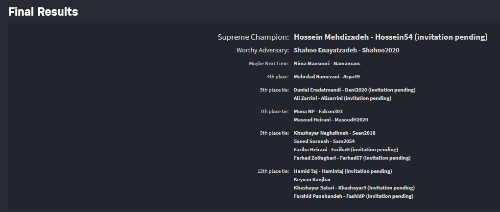 تبریک صمیمانه ی ما تقدیم به تمام شرکت کنندگان تورنمنت هشتم که در طول بیش از 74 مسابقه در طول یک هفته بسیار خوش درخشیدند.