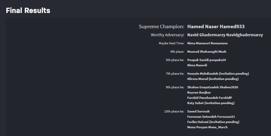 تبریک فراوان به سه نفر برتر تورنمنت هشتم که به حق شایسته ی این قهرمانی هستند: