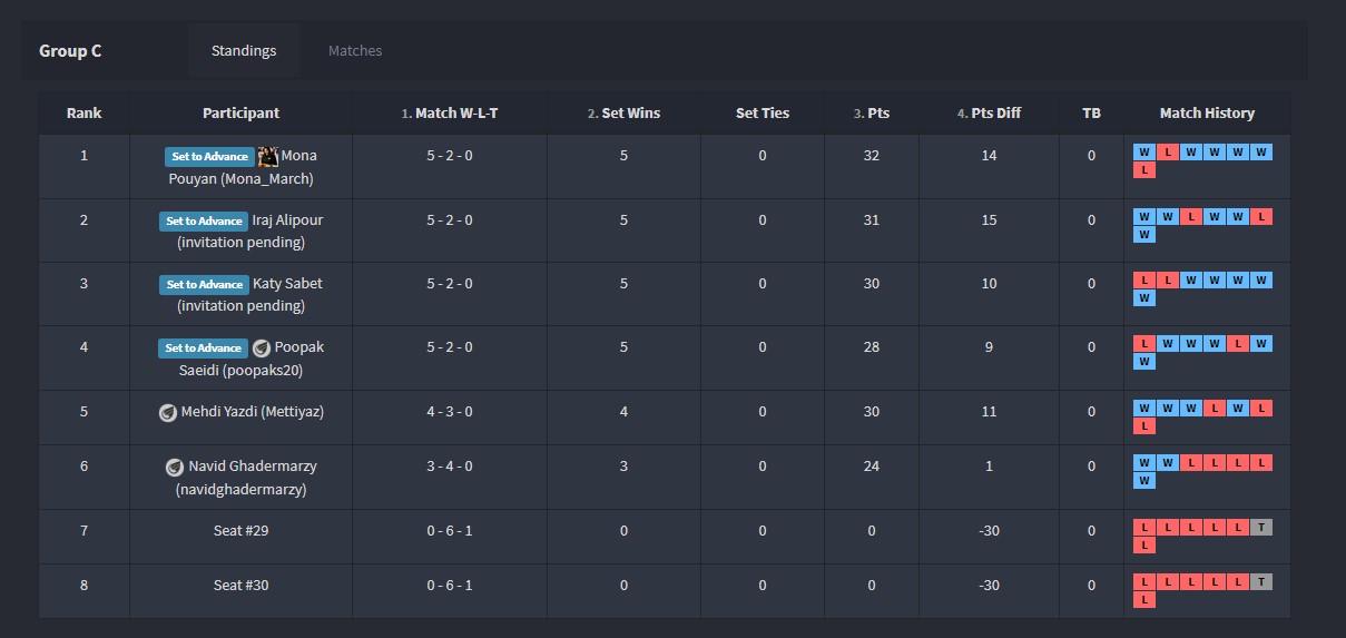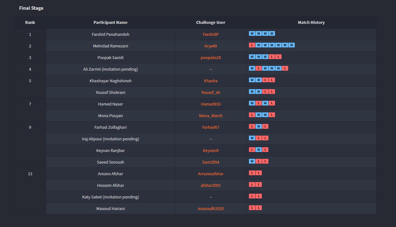 تبریک فراوان به تمام شرکت کنندگان تورنمنت یازدهم برگزار شده در روز جمعه 15 می 2020 که با شرکت در 80 مسابقه (50 مسابقه مقدماتی و 30 مسابقه ی نهایی) در طول یک هفته بسیار خوش درخشیدند: