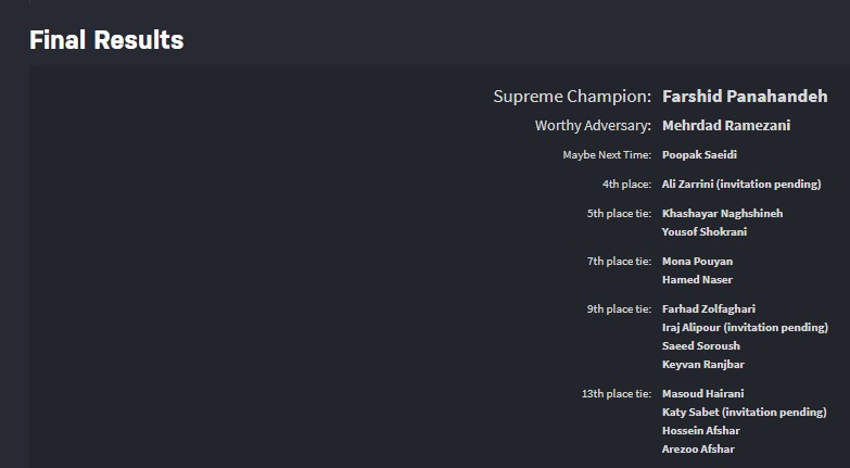 تبریک فراوان به سه نفر برتر تورنمنت هشتم که به حق شایسته ی این قهرمانی هستند: