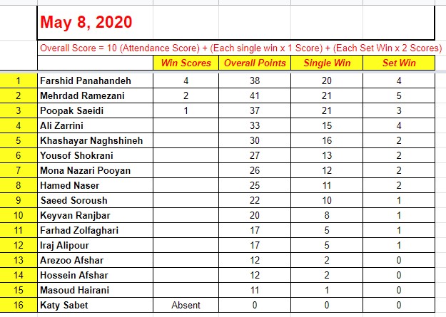 تبریک فراوان به شرکت کنندگان تورنمنت سیزدهم برگزار شده در روز یکشنبه 14 ژوئن 2020 و نفرات برتر این تورنمنت ،بهترین ها را در مسابقات آینده برای شان آرزومندیم:
